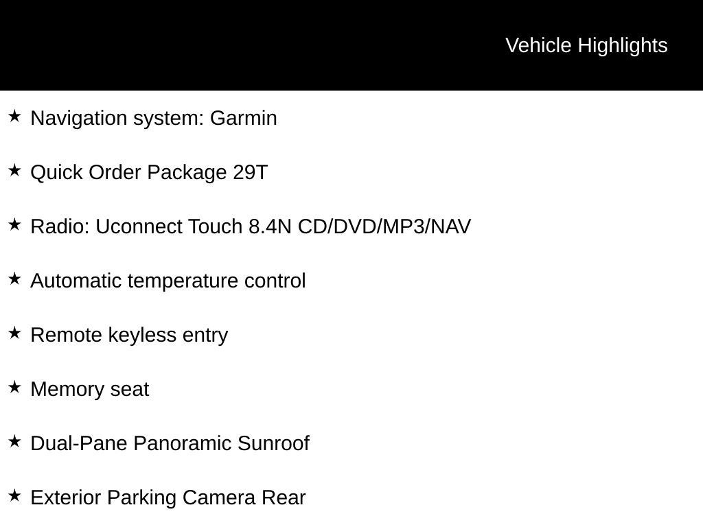 - Radio: Uconnect Touch 8.4N CD/DVD/MP3/NAV