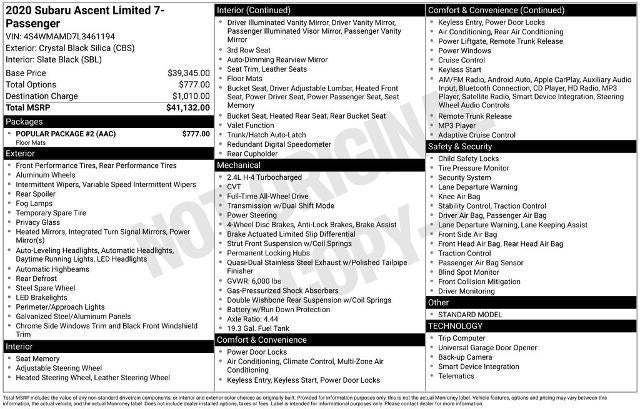 Ascent Limited, AWD, Brake assist, Exterior Parking Camera Rear, Front dual zone A/C, Fully automatic headlights, Heated Front Bucket Seats, Heated steering wheel, Memory seat, Perforated Leather-Trimmed Upholstery, Popular Package #2, Power driver seat, Power Liftgate, Radio: Subaru STARLINK 8.0" Multimedia Plus System, Remote keyless entry, Standard Model, STARLINK/Apple CarPlay/Android Auto, Wheels: 20" Dk Gray Aluminum Alloy w/Machine Finish.