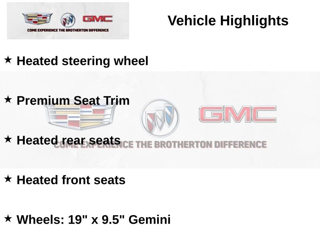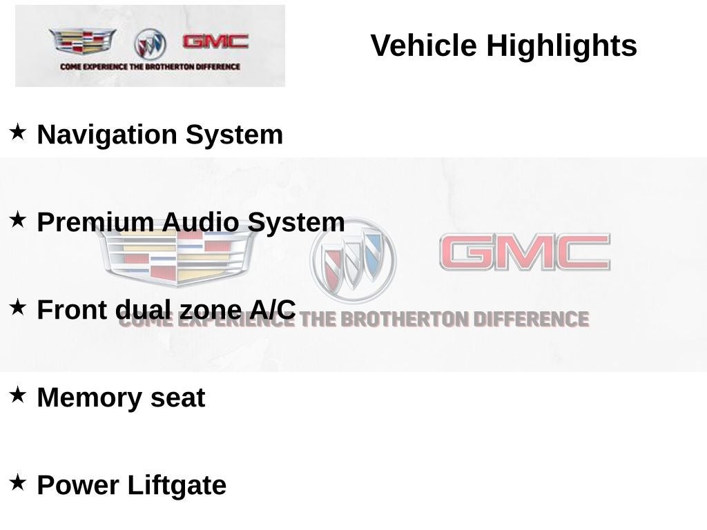 - Navigation System, Premium Audio System, Front dual zone A/C, Memory seat, Power Liftgate, Brake assist, Lane Departure Warning System, Exterior Parking Camera Rear, Fully automatic headlights, Active Cruise Control, Heated steering wheel, Heated front seats, Heated rear seats, Premium Seat Trim, Wheels: 19" x 9.5" Gemini, Rain sensing wipers