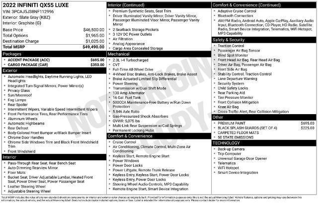 Powered by a responsive I4 engine and equipped with Continuously Variable Transmission (CVT) and All-Wheel Drive, the QX55 LUXE delivers a smooth, confident driving experience. With an impressive 22 city / 28 highway MPG, you can enjoy the thrill of the open road without compromising efficiency.