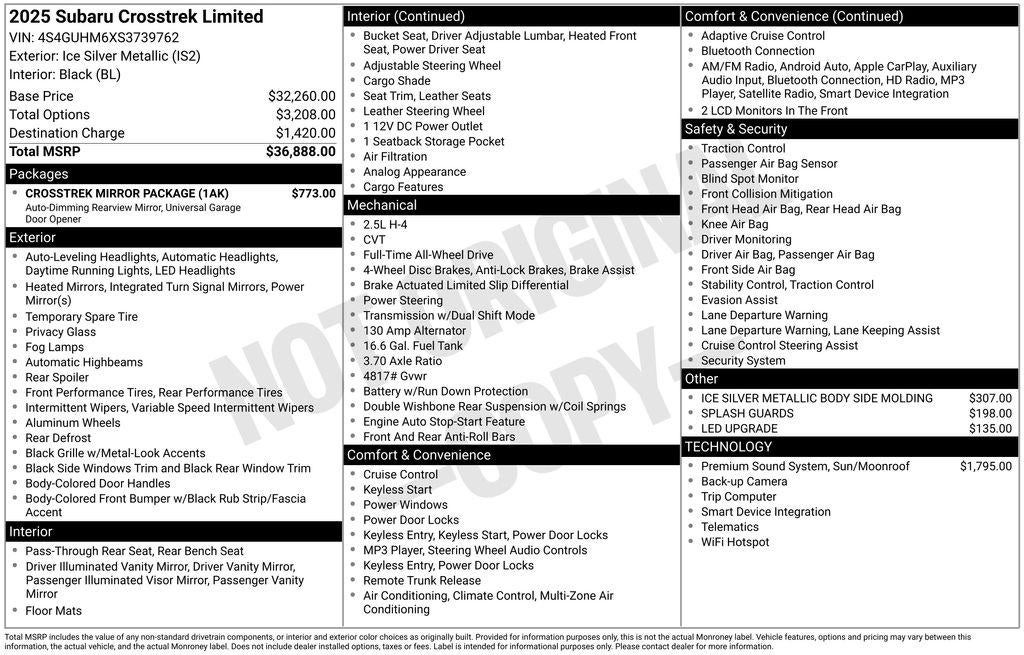 Comfort and convenience are at the forefront, with amenities like the Auto-Dimming Mirror with Compass and HomeLink, the LED Upgrade, and the Heated Front Bucket Seats. The Crosstrek Limited's versatile cargo space and split-folding rear seats ensure you can easily accommodate your active lifestyle, from weekend adventures to daily errands.